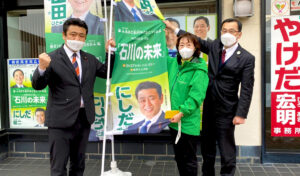 焼田県議や津幡町議の皆さんの先導で山田候補夫人と共に津幡町へ挨拶回りです